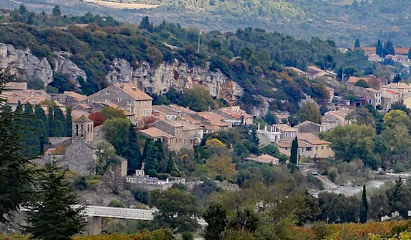 village du Minervois, au pied d’une falaise comprenant de nombreuses grottes ou caunes à l'origine du