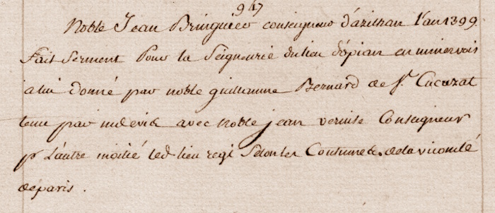 "Noble Jean Bringuier, conseigneur d'azilhan, l'an 1399
